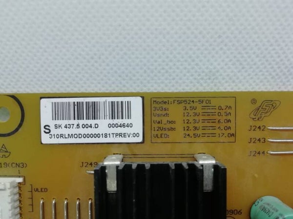 Part number 310RLM0D00000181TPBoardnumber FSP524-5F01Modelnummer 65PUS9809/12Part type Powerboard Tv Type and size Philips 65PUS9809/12