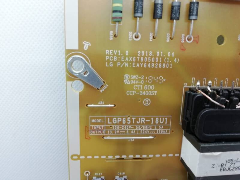 Part number EAX67805001 (1.4) EAY64928801 Boardnumber LGP65TJR-18U1 PLDL-L707A 3PCR02331A Modelnummer 65UK6400PLF Part type Powerboard Tv Type and size LG 65UK6470PLF