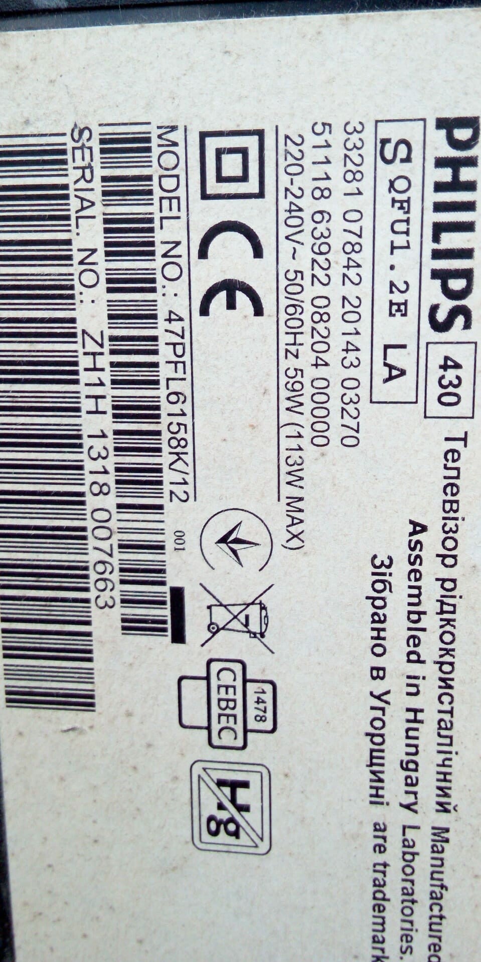 Tv Type and size Philips 47PFL6158K/12