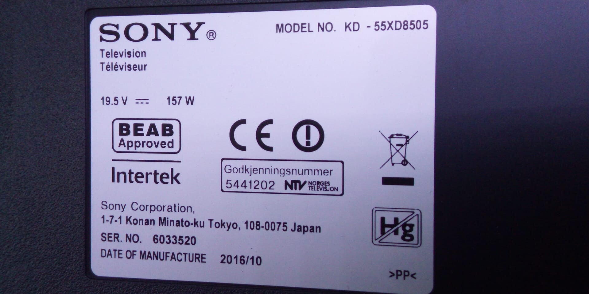 Tv Type and size Sony 55inch KD55XD8505