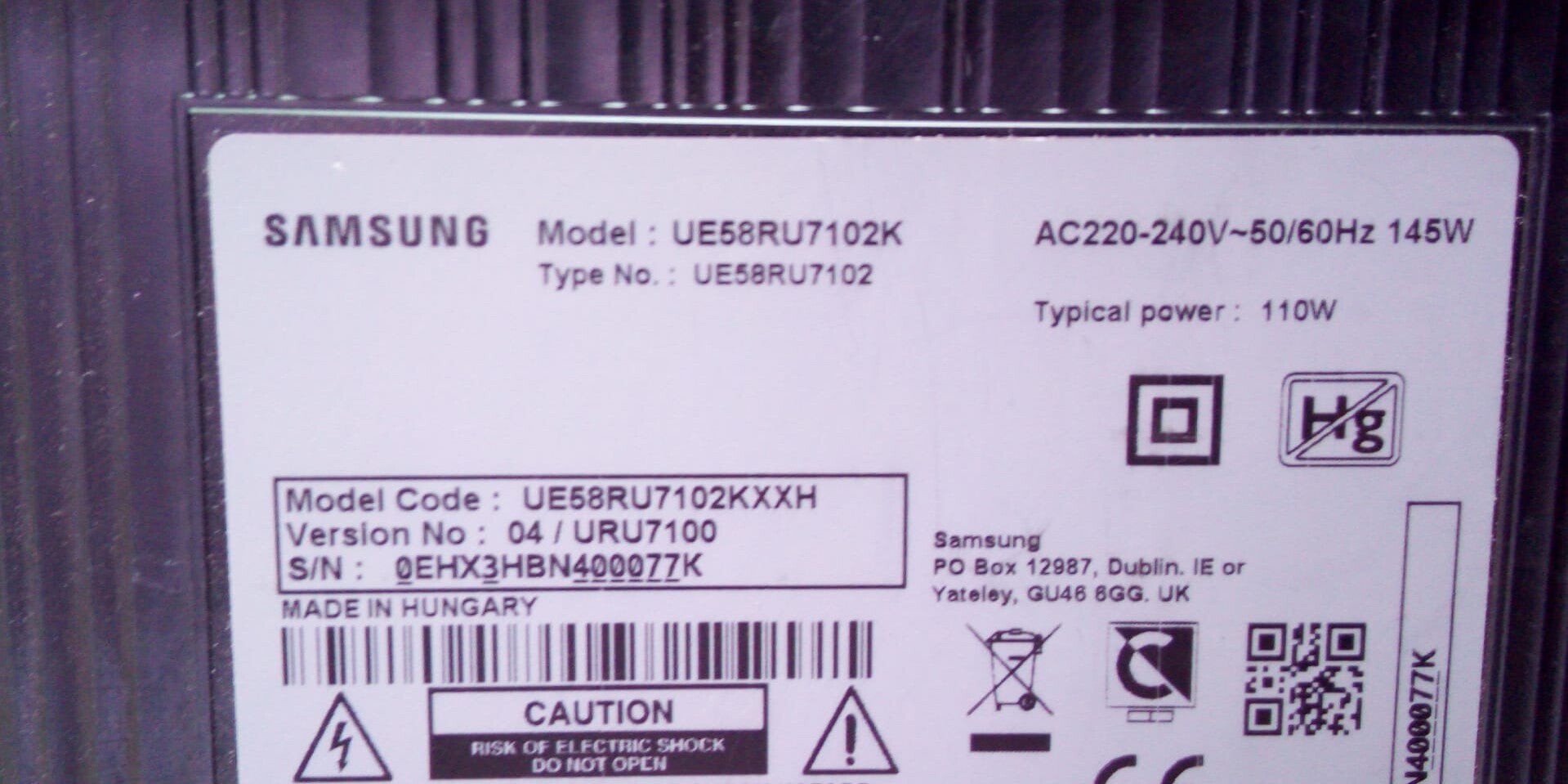 Modelnummer UE58RU7102K